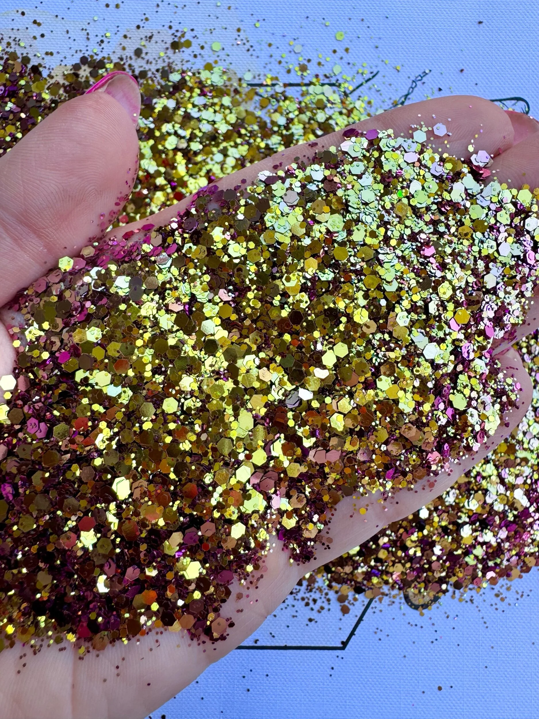 Our glitter is high polyester and solvent resistant. High polyester means your glitter will continue to sparkle even if your project needs to be sanded or cut. If using a clear coat or top coat, our glitters will not bleed color due to it being solvent resistant. Glitter is packaged in clear, heavy duty, and reusable bags, perfect for storing and pouring. This glitter has a heat resistance of 350 degrees.